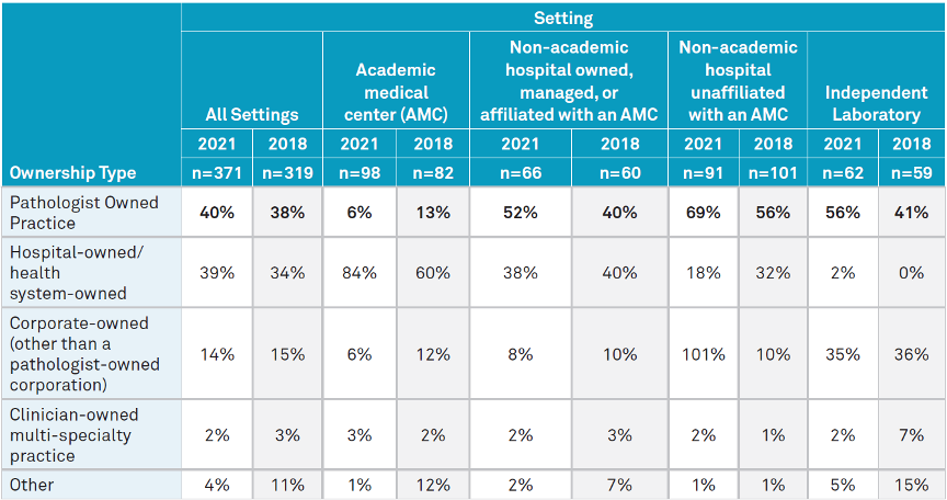 In addition, the 2021 report reported on changes in pathologist practice ownership. According to the 2021 report, although the percent of respondents’ practices that were owned by pathologists appeared to be fairly stable between 2018 and 2021, different patterns emerge when the data are disaggregated by practice setting. Specifically, the share of practices based in academic medical centers (AMCs) that are pathologist-owned fell from 13% in 2018 to 6% in 2021. Additionally, there were substantial increases in the share of respondents whose practices are owned by hospitals and health systems and in corporate-owned practices.