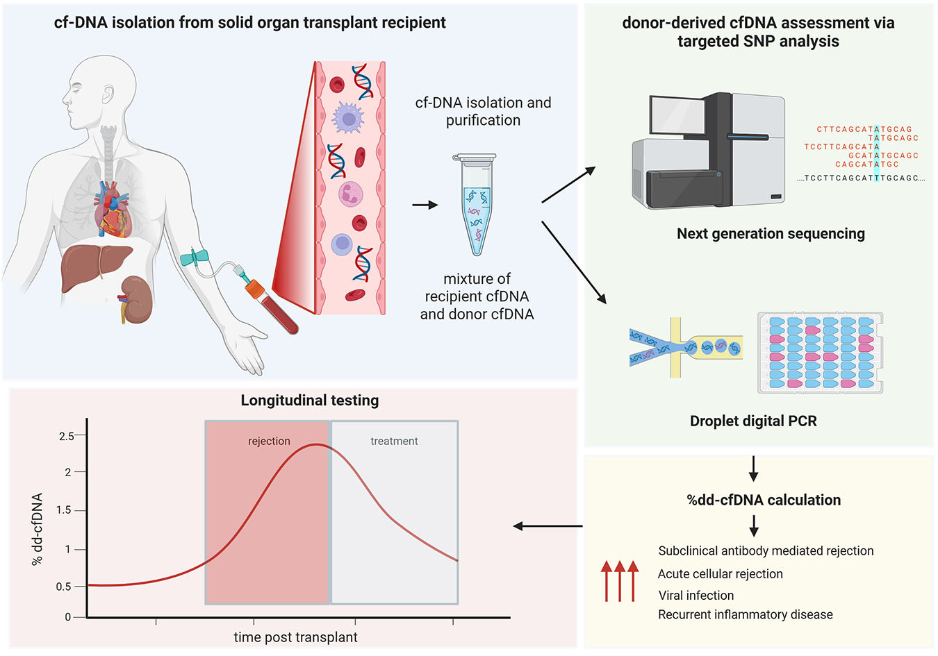 In transplantation, the fraction of the cfDNA derived from the graft donor cells of the transplanted organ (donor-derived cfDNA or dd-cfDNA) is typically very low. Under normal conditions, dd-cfDNA levels decrease after transplantation as the organ stabilizes3; however, elevated levels indicate cellular injury within the transplanted organ due to acute rejection, infection, or ischemia.4–6 During acute rejection, immune-mediated injury causes apoptosis and necrosis of graft cells, releasing donor-derived DNA into circulation. Similarly, ischemic or infectious injuries elevate dd-cfDNA levels. While distinguishing causes of allograft injury using dd-cfDNA is not yet reliable, low dd-cfDNA levels represent a useful negative predictor of acute rejection. Additional advantages of utilizing dd-cfDNA as a biomarker include noninvasiveness, as cfDNA testing requires only a blood sample; the potential to detect graft injury earlier than other methods or to enable the detection of subclinical grade injury; and the potential of real-time monitoring, as cfDNA reflects active cellular processes in real time, offering dynamic assessments of graft health when compared to static biopsy results.