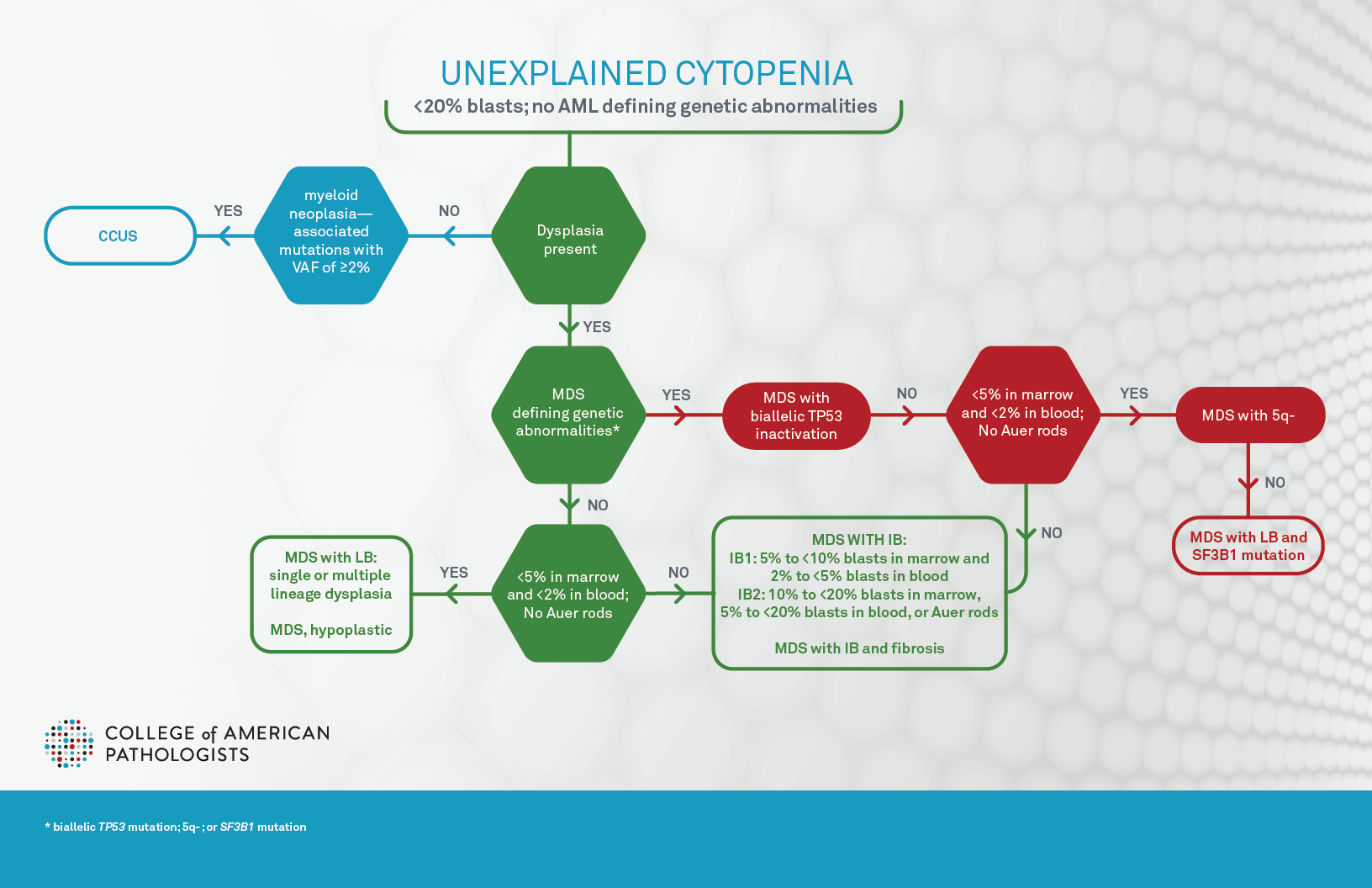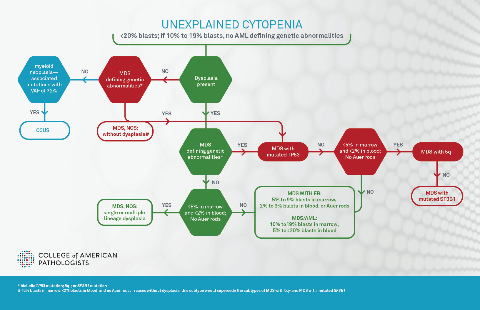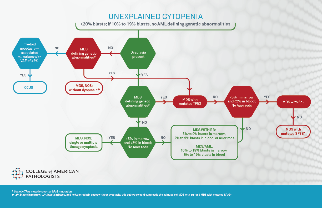 Both WHO5 and ICC define clonal cytopenia of undetermined significance (CCUS) as the precursor lesion of MDS. CCUS is clonal hematopoiesis (CH) detected in the presence of one or more persistent cytopenias, defined as anemia (hemoglobin <13 g/dL in males, <12 g/dL in females), neutropenia (neutrophil count <1.8 × 109/L), and/or thrombocytopenia (platelet count <150 × 109/L). Further discussion of CCUS can be found in another article on the CAP precision medicine page. The cytopenias are unexplained by reactive conditions and usually have persisted for four months or longer. Dysplastic changes can be seen, but must fall short of the diagnostic criteria for MDS (ie, <10% of cells showing dysplasia in each lineage), and blasts should not be increased. CH is defined as harboring chromosomal alterations, and/or one or more myeloid neoplasia–associated somatic driver mutations with variant allele frequency (VAF) of ≥2% or ≥4% for X-linked gene mutations in male patients. Of note, one critical discrepancy between ICC and WHO5 is that in ICC, patients with MDS-defining genetic abnormalities (Table 1 and Figure 1B) are excluded from CCUS and are instead classified as MDS with subtypes discussed below, since ICC allows absence of dysplasia in these patients for a diagnosis of MDS.